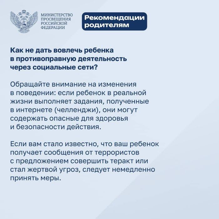 РЕКОМЕНДАЦИИ МИНПРОСВЕЩЕНИЯ РФ «КАК НЕ ДАТЬ ВОВЛЕЧЬ РЕБЁНКА В ПРОТИВОПРАВНЫЕ ДЕЙСТВИЯ ЧЕРЕЗ СОЦИАЛЬНЫЕ СЕТИ»
