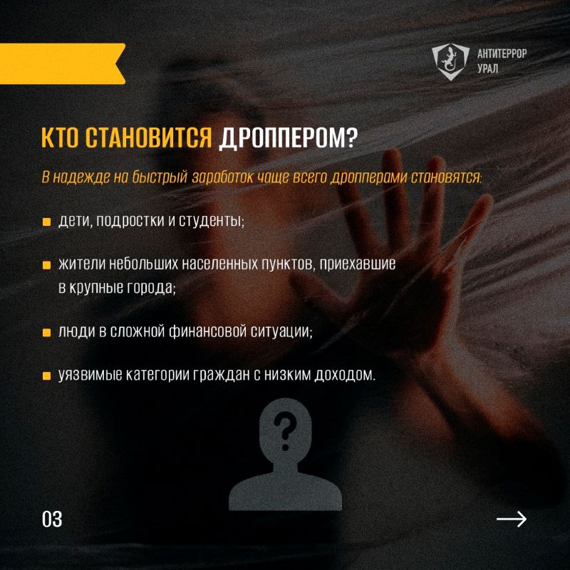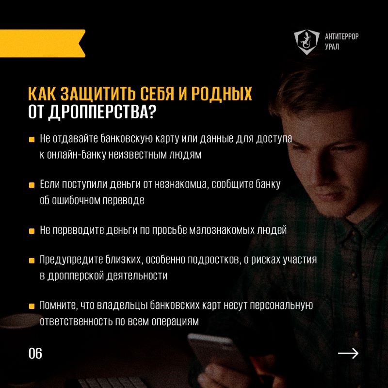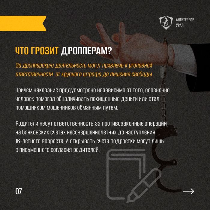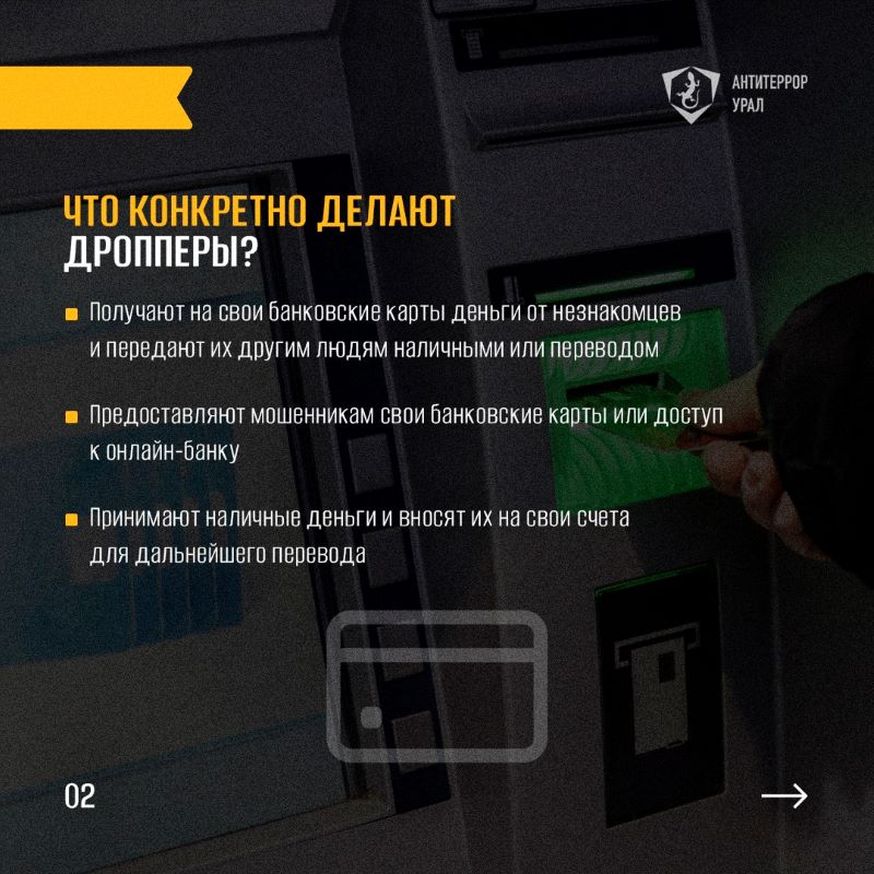 Сравнительно недавно в Интернете появилась ещё одна угроза – дропперство. Под видом легкого заработка для подростков скрывается помощь мошенникам и даже террористам. Уголовная ответственность наступает с 16-летнего возраста, но родители несут ответственность за банковские операции детей с 14 лет. Мы подготовили карточки, в которых рассказываем, что делают дропперы, можно ли случайно стать соучастником преступления и как обезопасить себя и своих близких. Обязательно поделитесь карточками с родными, друзьями и знакомыми!