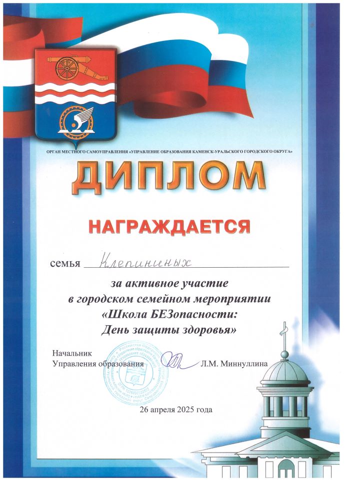 26 апреля 2025 года стал для Клепининой Дарьи будущей первоклассницы разновозрастной группы № 9 и меня её мамы Натальи Николаевны запоминающимся днем. Мы приняли участие в городском семейном мероприятии под названием «Школа БЕЗопасности: День защиты здоровья». Организаторам данного мероприятия является орган местного самоуправления «Управление образования Каменск-Уральского городского округа».