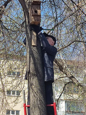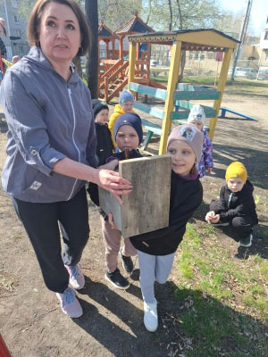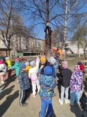 Под руководством воспитателей и родителей дети помогали устанавливать домики на деревьях. Каждый скворечник был закреплен надежно, чтобы обеспечить безопасность пернатых жильцов.