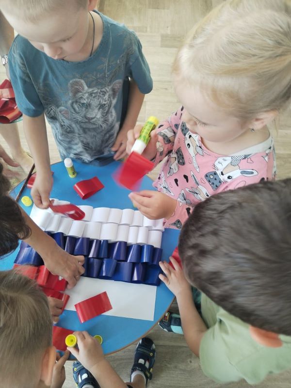 А еще дети группы № 8 с большим удовольствием мастерили аппликации российского флага. Старательно подбирали цвета и клеили полосочки, создавая свой маленький символ большой страны!