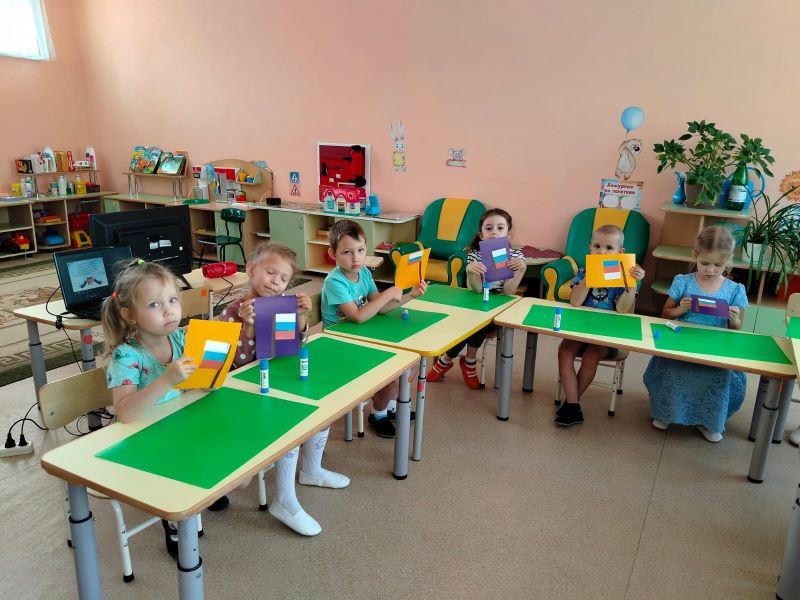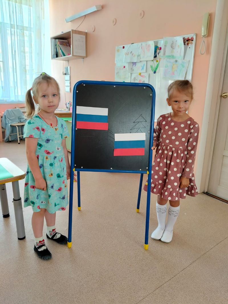 Воспитанники же группы № 7 сделали большую объёмную аппликацию Российского флага и с гордостью повесили её в приемной группы.
